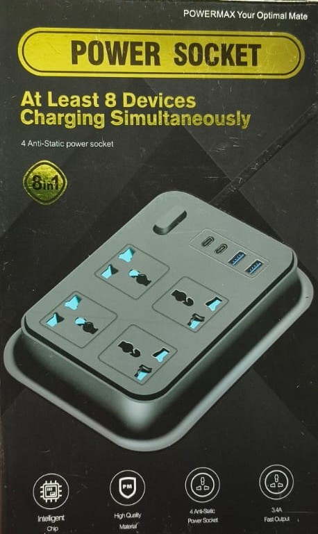 POWERMAX Multi-functional Power Socket Adapter. This adapter is designed for modern households or offices requiring multiple charging ports and universal plug compatibility, combining safety features with efficient charging capabilities.